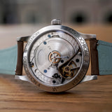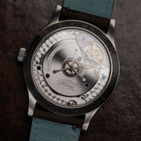 The development of the jumping second mechanism for the Erwin couldn’t be more Habring. It is elegantly simple and pragmatic, as the system comprises no more than 7 additional components compared to the classic time-only movement of the Felix model. Functional reliability and service friendliness are important to Habring². This deadbeat or Seconde Morte mechanism is neatly integrated within the A11 base movement, adding only 2mm to the whole thickness of the watch, compared to a classic Felix model. The hand-wound A11S calibre is manufactured in-house by Habring² in Austria, with most parts either produced in-house by Habring² or custom-made by independent suppliers according to Habring² specifications.